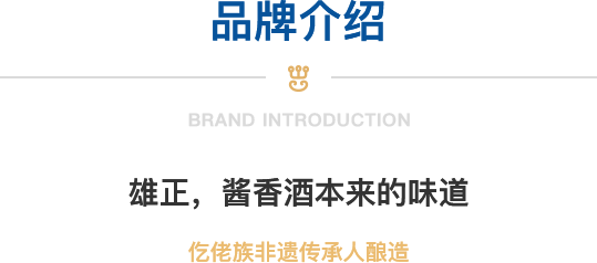 公元前135年 , 仡佬族釀出了第一壇醬香酒 , 雄正集團作為仡佬族釀酒技藝非遺傳承企業 , 旗下唯一產品“雄正醬香酒”產自貴州省仁懷市茅臺鎮7.5平方公里中國醬酒核心小產區 , 以本地仡佬族自種紅纓子糯高粱為原料 , 采用仡佬族傳承2000多年的非遺釀造工藝 , 結合特有的赤水河水、氣候等條件釀造而成 , 每一瓶都由仡佬族釀酒技藝非遺傳承人張再彬先生親釀調制 , 酒體干凈, 飲后舒服 , 是“醬香酒本來的味道”。
